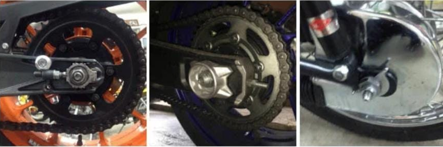 Para mantener la cadena en el ajuste adecuado, las motos incorporan tensores de cadena, que en su mayoría constan de un tornillo y una contratuerca que actúan sobre un tope a cada lado del eje trasero. De esta manera, extendiendo los tornillos alejaremos la rueda del piñón de ataque y de esta manera, la cadena se tensará.